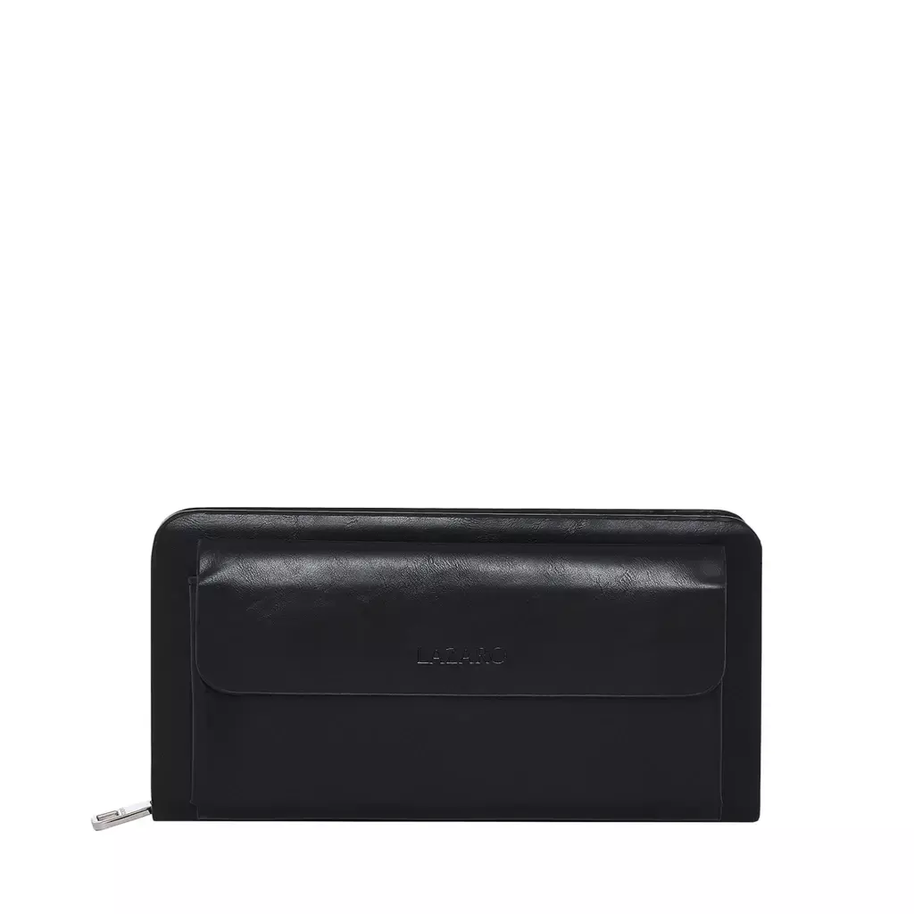 - Incluye bolsillo externo con solapa y doble broche imán, compartimiento central con cierre metálico y un interior forrado con doble división, una con cierre pvc